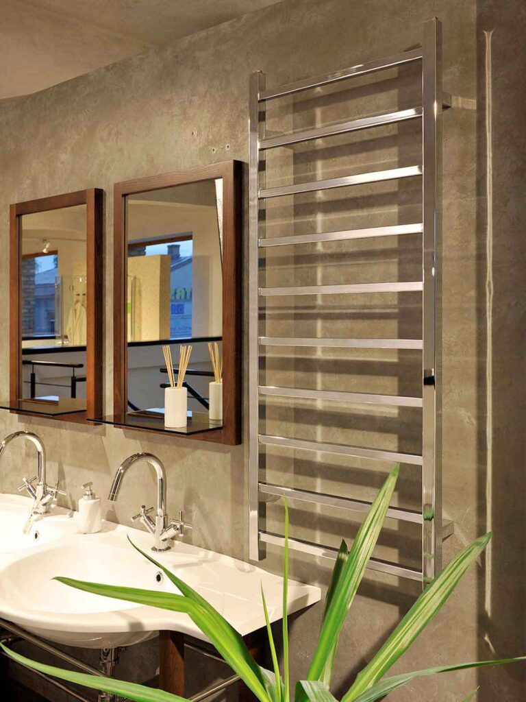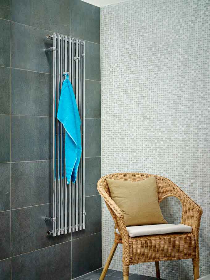 Handdukstorken har öppet på ena sidan så man enkelt kan hänga upp handdukar för torkning på de ganska grova ovala rören som gör att torken får ett Elegant men ändå robust utseende.